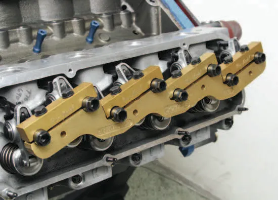 with stock rocker arms. The thing is, when you increase lift and valve-spring pressure, a stamped-steel or cast roller-tip rocker arm doesn’t always stand up to the test, especially when spring pressures climb to more than 350 pounds. Even the best stamped-steel, roller-tip rocker arm will fail when overstressed.