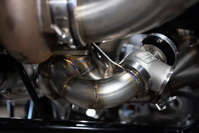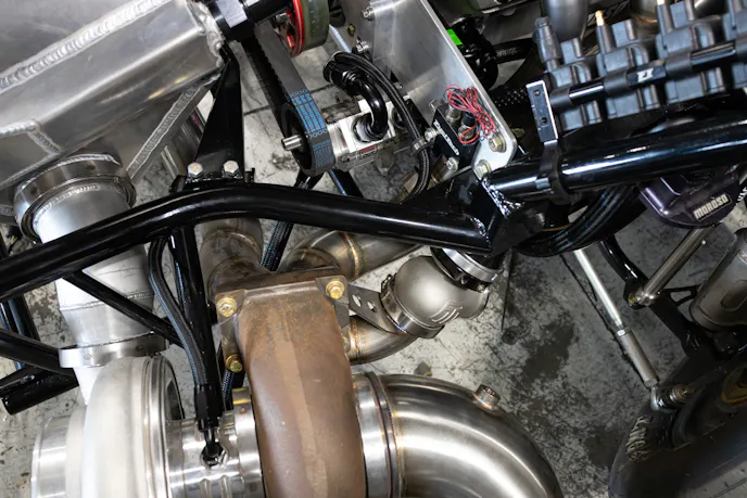 On the hot side, we used a 2-into-1, 3-inch billet merge from Shearer Fabrications to connect the stainless steel headers to the Hart’s turbo, and then it was just a matter of connecting the dots on the cold side, between the turbo, intercooler, and throttle body with a mass of aluminum tubing. The merge is not only one of the harder things to fabricate, but it can also cost you 300 horsepower if not done properly (according to Shearer). Shearer Fabrications makes the merge from 1-inch thick bar stock from stainless steel to mate to the T6 flange. We opted for the fully welded version so it was ready to go, but they also sell the flange by itself, a DIY kit with the flange and a 3D printed trace fixture to make it yourself, and even just the trace fixture by itself. These are some of the secrets to getting a bigger single turbo to spool quickly off the starting line and win championships.