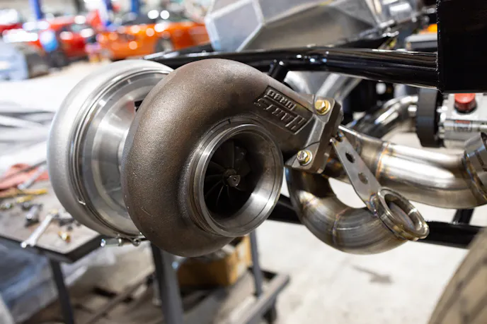 Pressurizing the intake charge of air for this project is a Harts Turbo piece that is legal for the Ultra Street class rules. It’s a 76mm turbocharger that began life as one of the company’s H4 product line. These turbochargers feature a billet aluminum bearing housing that is made in-house along with the backplates and compressor wheel. This unit is equipped with the new Gen-2 turbine wheel and updated 76mm compressor wheel, with an updated dual oil seal design keeping the lubrication precise.