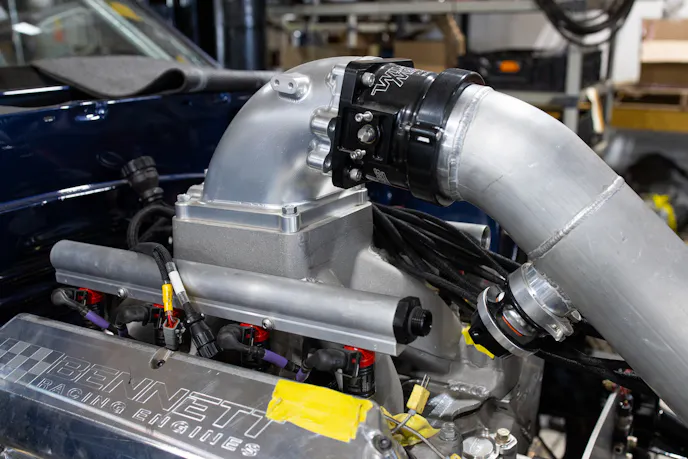 Guiding the incoming air and fuel into the Bennet Racing Engines’ small-block Ford Ultra Street engine is a CHI intake manifold set up for fuel injection. It is topped by a billet aluminum Holley 4500 throttle body adaptor elbow (P/N: 300-254) that holds a Wilson Manifolds billet 105mm dual-seal throttle body (P/N: 471105DHB). The throttle body uses a sealed shaft, tested to 100psi to be stable under pressure and temperature. We paired it with the Ford-style throttle cable bracket (P/N: 481102) to command the throttle blade, 4-inch dual seal clamp (P/N: 486325) to connect to the charge pipe, and finally an IAC block-off plate (P/N: 481002).