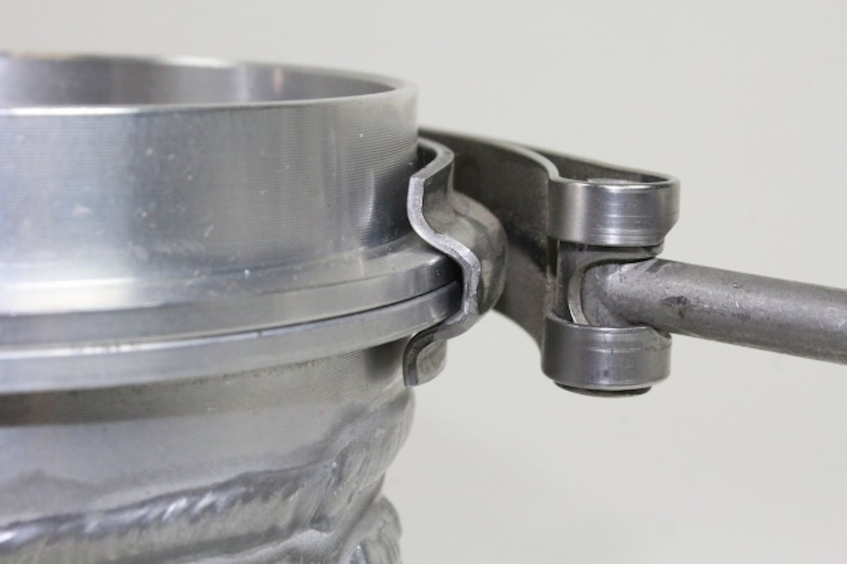 When compared to 2 or 3-bolt flanges, the V-band connections are lighter, quicker and easier to take apart. In most cases the V-band clamps are economical when you consider the cost of time in installation and reassembly. V-band connections require a smaller fitment envelope as compared with multi-bolt flanges, and the biggest advantage, the design of the V-band clamp applies uniform force around the flange which maximizes the seal potential of the flanges. Stevenson says, “The biggest advantage with V-band clamps in racing is that it is a quick method of attaching components. They can greatly improve maintenance time between rounds during a race when you need to get a lot of parts taken off and put back on quickly.”
