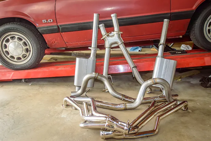 Beginning in 1986 Ford started equipping the 5.0 HO engine with stainless steel dual exhaust, including stainless tubular shorty headers. While this was an improvement from the heavier cast manifolds, the shorties were still small in diameter, and choked by the factory four-cat H-pipes, and restrictive factory mufflers.
