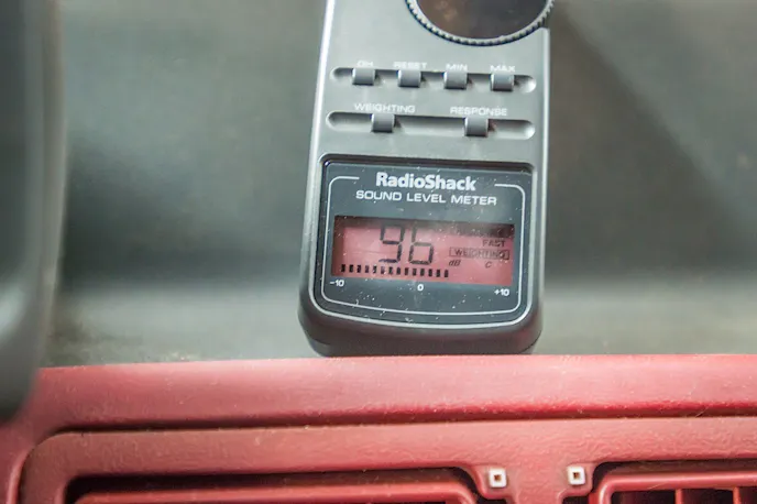 Prior to our installation we broke out the decibel meter and checked the car cruising, at idle, and at wide open throttle. We found 95 db cruising at 70 mph, 82 db at idle, and 96 db at wide open throttle. With our new system installed we now have 86 db at idle, 98 db cruising at 70 mph, and 100 db at wide open throttle. Not that dramatic of a difference in terms of the in-car volume.