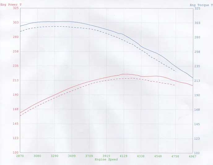 The solid lines represent our best dyno pull of 229 hp at 308 ft-lbs of torque. A gain of 8 hp and 12 ft-lbs. The dashed lines are our previous best run before this installation.