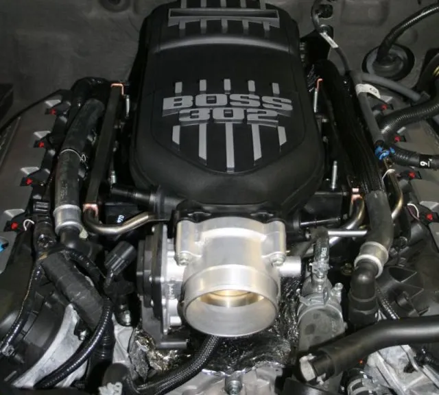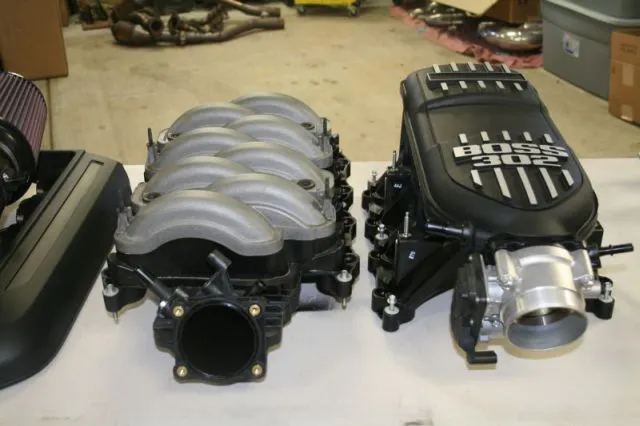 Compared to the production Mustang GT intake manifold, you can see two dominant changes. First is a rather large plenum box that sits under the Boss 302 logo. By having the intake runners feed from this box, the air arriving at individual cylinders is more equally distributed. Feeding the cylinders with short length runners also provides advantages in the higher rpm ranges. Without variable valve timing, though, the effect of Helmholtz tuning via runner length would result in a rather peaky increase in power, however valve timing adjustments can be used to broaden the range over which the benefits are seen.