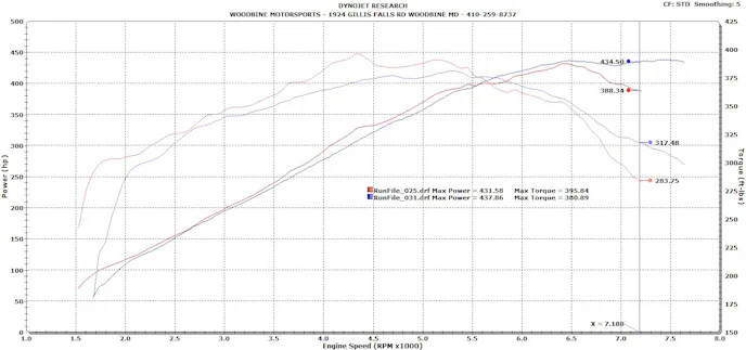 From here, it's on to the dyno. In addition to the JLT cold air kit, the car already has Dynatech long tube headers, with an offroad X-pipe installed. The change actually has little impact on the power curve until the 6500 rpm range is hit, and then the difference becomes significant - almost 50 horsepower. According to Jones, “The extended RPM range is where the most power is felt and the car feels totally different and much stronger. We are in the infancy of tuning this intake and are continuing to experiment with the tune to gain more peak numbers. I’ve actually had to ask SCT if they could remove the hard coded rev limit of 7800 on the car so I can see if it will still make power at 8000. To gain almost 50hp at 7200 is something you really feel.”