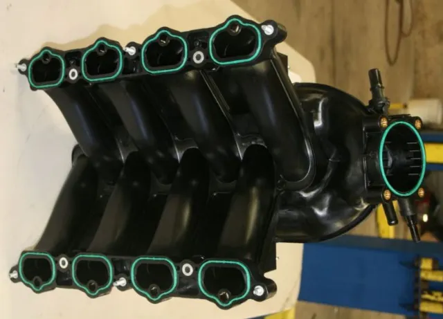 Here's the new Boss 302 intake manifold. It arrives with all the needed O-ring gaskets already in place. The stock throttle body is now installed onto the Boss intake. Due to the increased height of the manifold, the throttle body now points downwards. This caused a minor inconvenience with the JLT cold air intake already on the car. A different silicone adapter had to be found and installed later on.