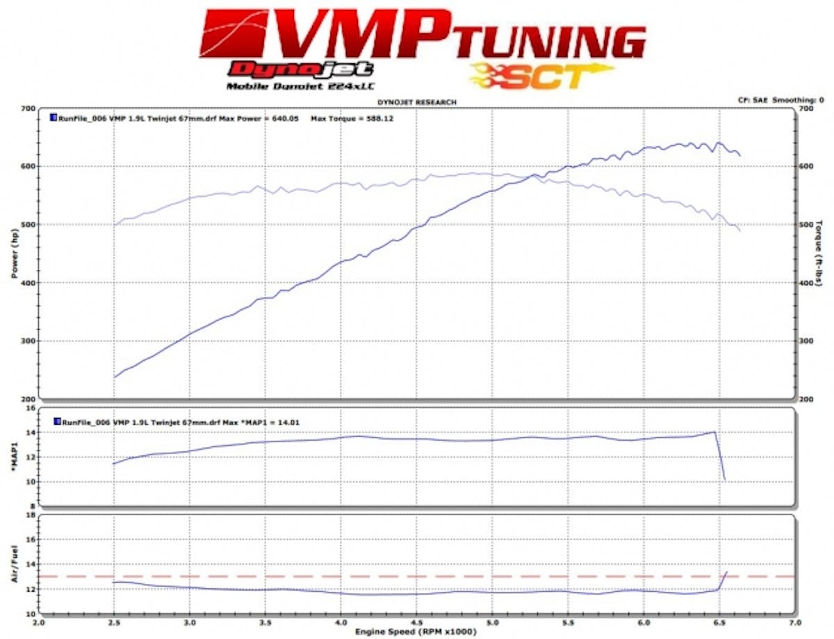 The new blower really adds power, too. On a recent dyno test of a three-valve ROUSH RS3, it added more than 100 rear-wheel horsepower – pushing output well past the 500-rwhp level. The official numbers were 501 rwhp vs the stock trim’s near 400 horses to the tires, while the torque numbers jumped to 492 ft-lbs. The test was performed on an otherwise stock vehicle, with the blower pulley’d for 10-12 pounds of boost. Starkey also recently performed this upgrade on an built three-valve engine, where they could take further advantage of the added potential of the TVS blower. This particlular engine also featured VMP’s Twinjet 67mm throttle body, and was able to spin the dyno rollers to 640 hp at the rear wheels.