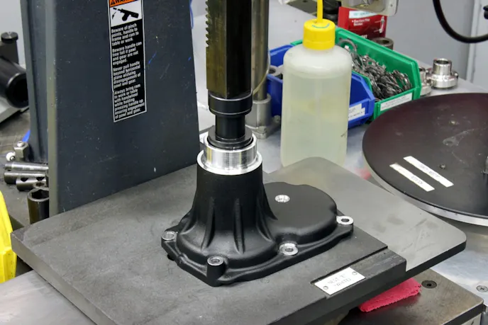 The front seal is then installed into the cover. It keeps the synthetic lubricant inside the gearbox under the extreme temperatures and pressures that the unit will be subjected to once it is in service.