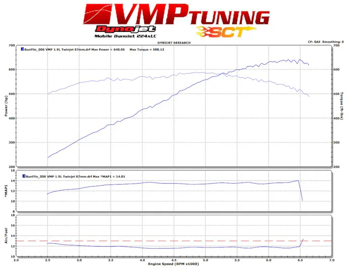 The new blower really adds power, too. On a recent dyno test of a three-valve ROUSH RS3, it added more than 100 rear-wheel horsepower – pushing output well past the 500-rwhp level. The official numbers were 501 rwhp vs the stock trim’s near 400 horses to the tires, while the torque numbers jumped to 492 ft-lbs. The test was performed on an otherwise stock vehicle, with the blower pulley’d for 10-12 pounds of boost. Starkey also recently performed this upgrade on an built three-valve engine, where they could take further advantage of the added potential of the TVS blower. This particlular engine also featured VMP’s Twinjet 67mm throttle body, and was able to spin the dyno rollers to 640 hp at the rear wheels.