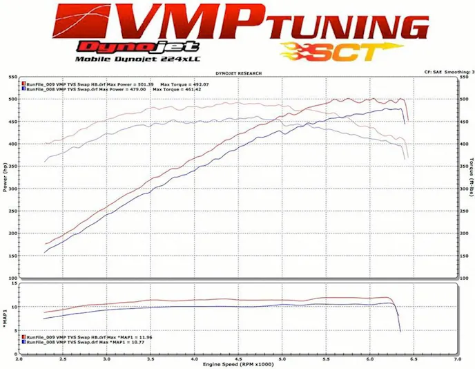 Just as important as the max numbers, however, is the range of performance across the entire rpm band, which clearly shows the effectiveness of the larger, more efficient blower. At every rpm step, the engine produced more horsepower and torque, with the spread between the old M90 setup and the TVS blower growing as the revs increased. Particularly impressive is how the torque hangs in through the higher rpm range. It crosses the 450-rwtq mark by 3,000 rpm and doesn’t drop below it until about 5,700 rpm. The M90 trim didn’t achieve peak torque until nearly 4,000 rpm and basically flittered with it until finally dropping below the mark permanently by 5,000 rpm.