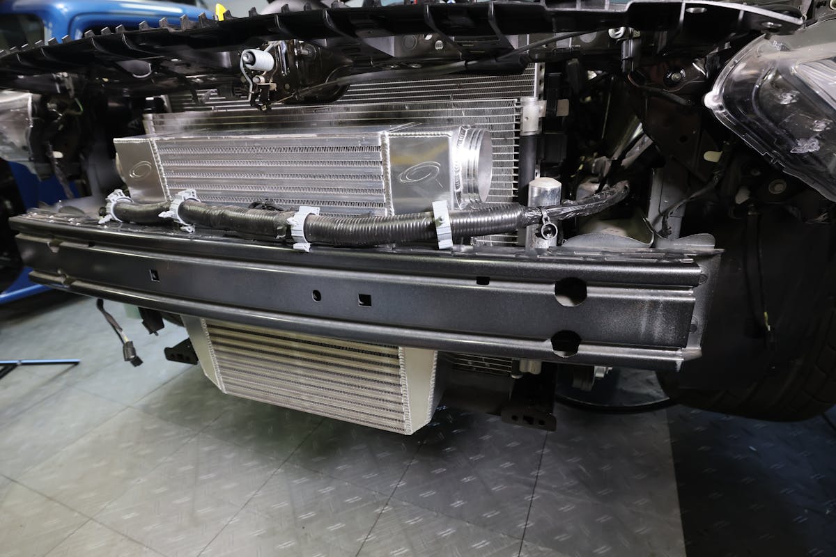 After refilling the cooling system and checking everything over to make sure hoses and wires are routed and secured correctly, the front bumper is reinstalled along with the engine cover.