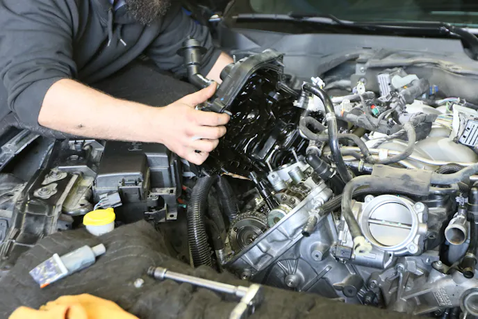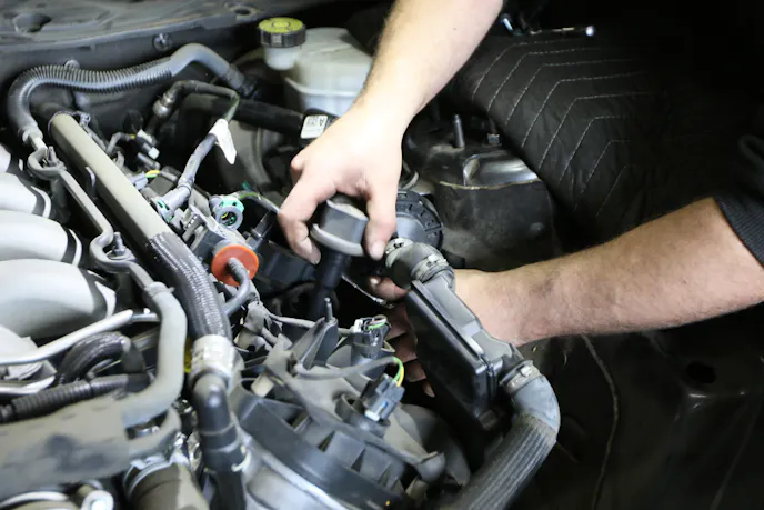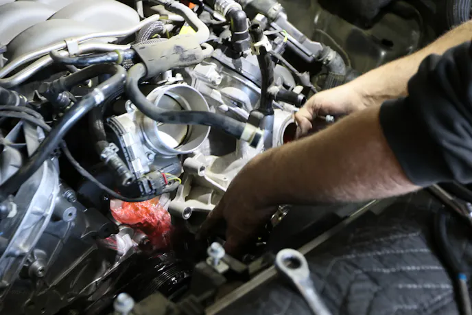 Technician Mike Russell at CCC Motorsports in Santee, California is our faithful companion on the latest automotive journey with Project Magneto — namely, installing our billet oil pump gears. We got started by draining the radiator and oil. Russell then began work on the air intake system, unplugging all attached sensors and emissions plumbing before pulling the intake tube, air box, and filter. Next, he turned his attention to the battery, which needs to be completely removed along with the surrounding heat shielding to gain better access to the rear coils and spark plugs on the passenger side. Occasionally, Russell does remove the windshield wipers in order to get under the cowl to remove this piece. But, they were being a little stubborn and he managed without it this time. The coils and plugs were next on the agenda.