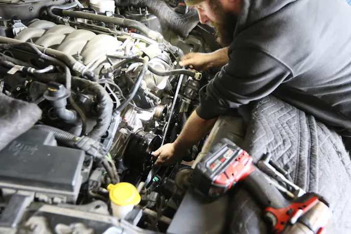Removing the fans provided better access to the accessory drive, which Russell removed, starting with the water pump before progressing to the harmonic balancer. This gained access to the timing cover, which was promptly removed along with the timing chains and oil pump. Russell also dropped the oil pan a few inches for better access to the oil pump pickup, which is unique to the Gen-3 Coyotes.