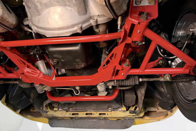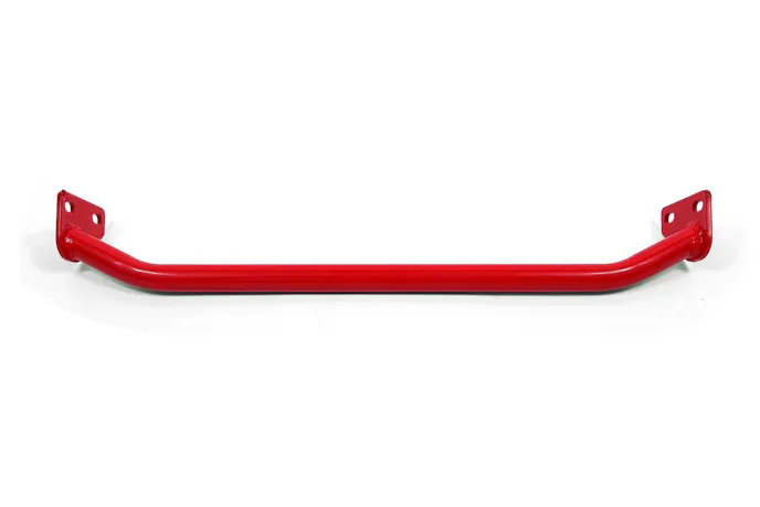 We also added sway bars to reduce body roll. Combined with the coilovers and control arms, they transform the car’s feel from a wallowing cruiser to a confident corner-carver. Under hard braking, the A-arm support brace (P/N CRB740) stiffens the front crossmember, reducing flex and improving stability.