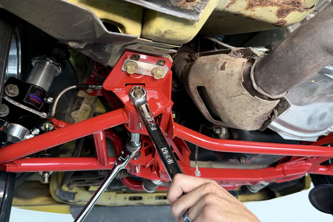 Up front, the Fox’s stamped-steel K-member was another area begging for replacement. It was built for mass production, not precision or performance. BMR’s K-member (P/N KM734) reduces weight, adds strength, and offers more clearance for headers and oil pans, while also improving geometry for coilover conversion. We paired it with BMR’s tubular A-arms (P/N AA038), which reduce unsprung weight and improve strength compared to factory arms. The package also creates room for coilovers, which are essential for dialing in ride height and spring rates on a car like this.