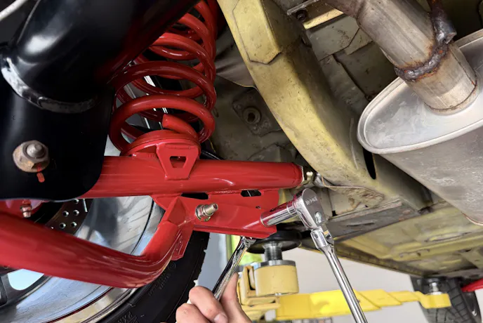 Out back, we opted for BMR’s lowering springs (P/N SP029) with a 1-inch drop and a 235-pound rate. They strike a balance between comfort and performance, and with the convertible chassis, we wanted to avoid anything too stiff that might rattle teeth on the street. Pairing them with BMR upper (P/N UTCA014) and lower (P/N TCA051) control arms locks in geometry and replaces the old rubber bushings with modern designs that reduce deflection without adding noise or harshness.