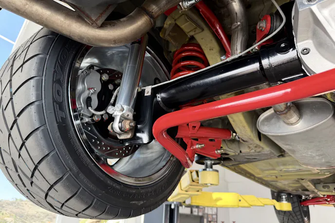 The stock Fox suspension relies on big coil springs in the K-member perches up front and outboard buckets in the rear. It’s a simple, inexpensive system, but it doesn’t allow for modern tuning or easy ride-height adjustments. Switching to a coilover system is one of the biggest upgrades you can make.