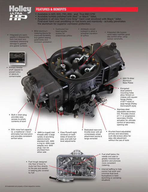 In 2011, Holley released a new aluminum Ultra HP 4150 Series carb with a total of 30 new improved features, which is five pounds lighter that previous 4150s and has larger 1.6-inch venturis. Bill Tichenor, Director of Marketing for Holley said that as engines get bigger, “Holley is responding with bigger carbs.”