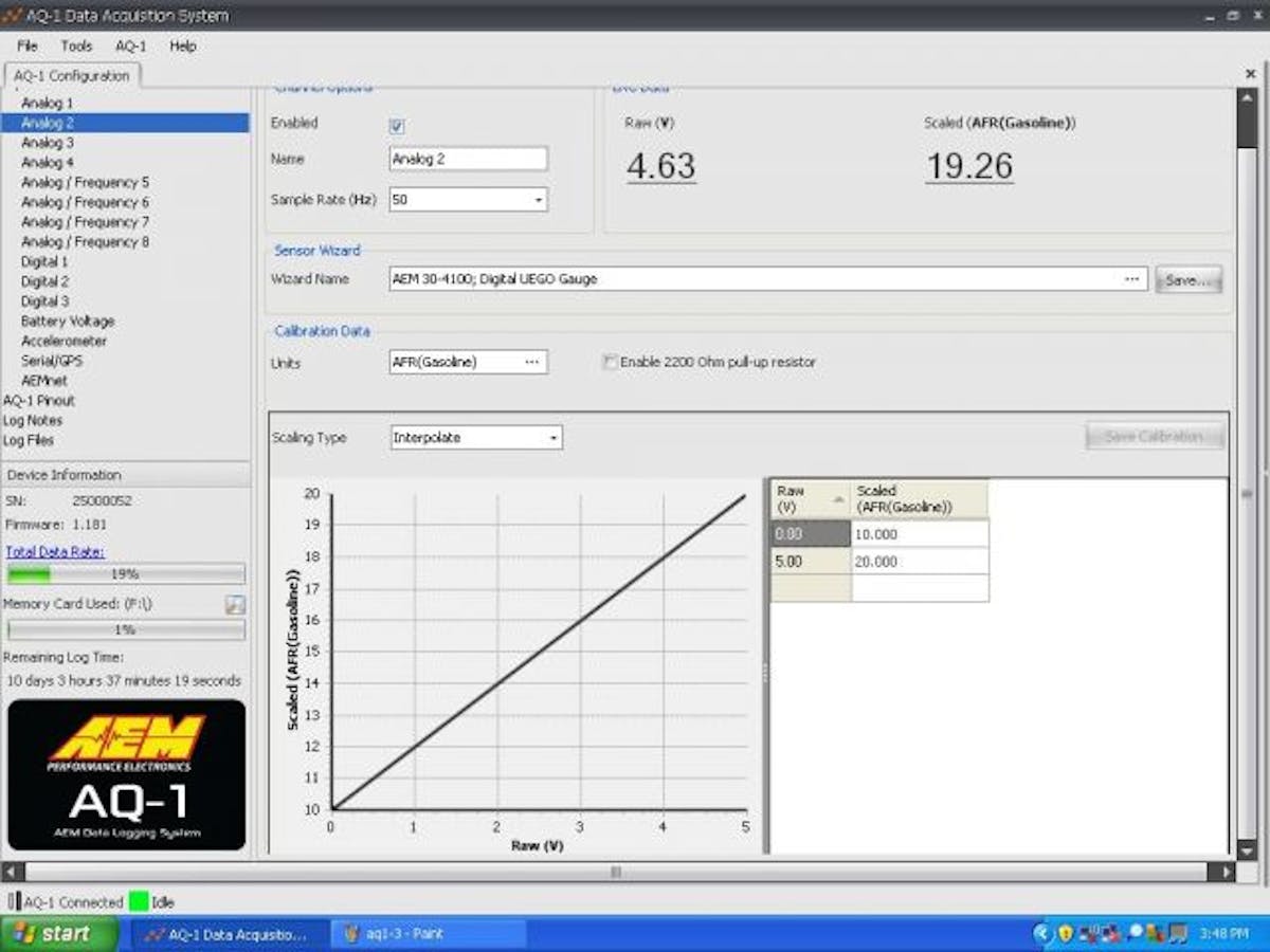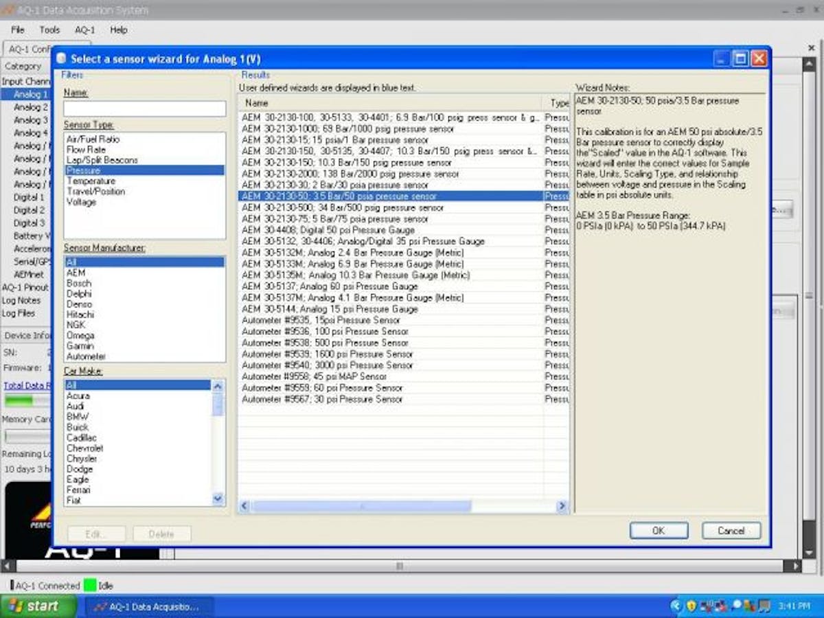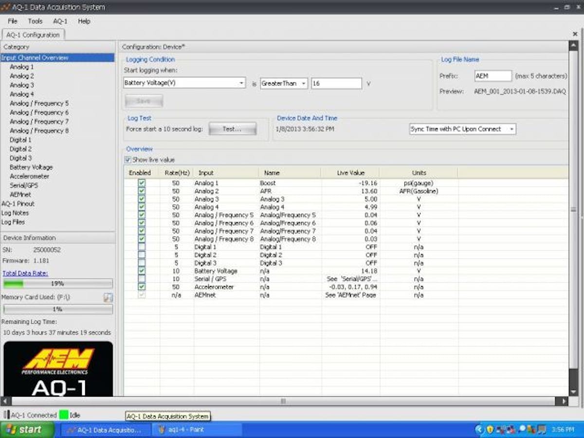 We walked through the AQ-1 setup process. The AQ-1 software is simple and straightforward to configure. Much like setting up a new piece of hardware on your home computer, the AQ-1 auto detects devices and inputs connected to it. The proper calibrations must be set and inputs to be logged selected.