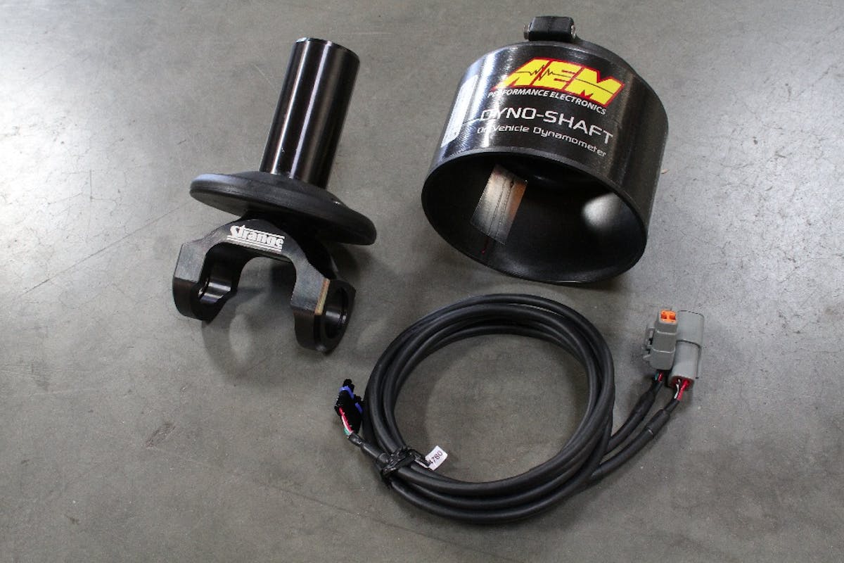 The AEM Dyno-Shaft works by measuring the twist in the driveshaft before the rear differential. -Paul St. Clair