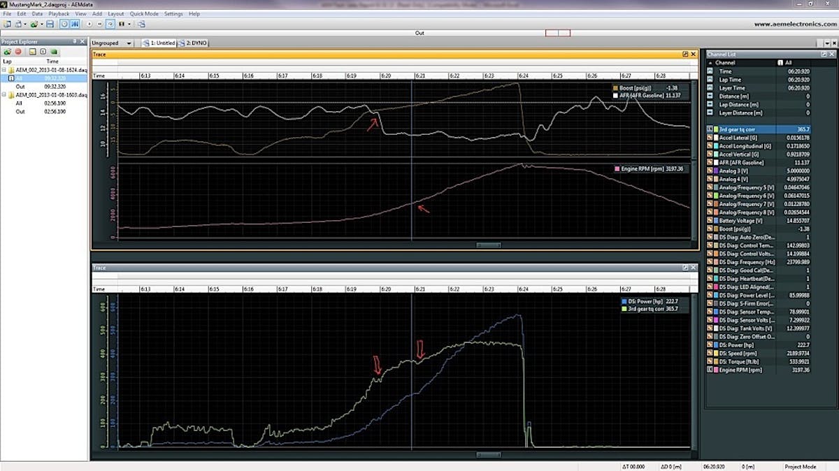 The Dyno-Shaft relies on resistance, “It measures the twist in the driveshaft before the rear differential,” according to Paul St. Clair of AEM Electronics. The resistance against the driveshaft is from the tires. As the car is driven on the track or the street, the Dyno-Shaft is measuring how much power is being put through the tires to the surface effectively at any given point. A drop in power shown by the Dyno-Shaft will typically indicate one of two things, either tire spin, or a drop in engine performance.