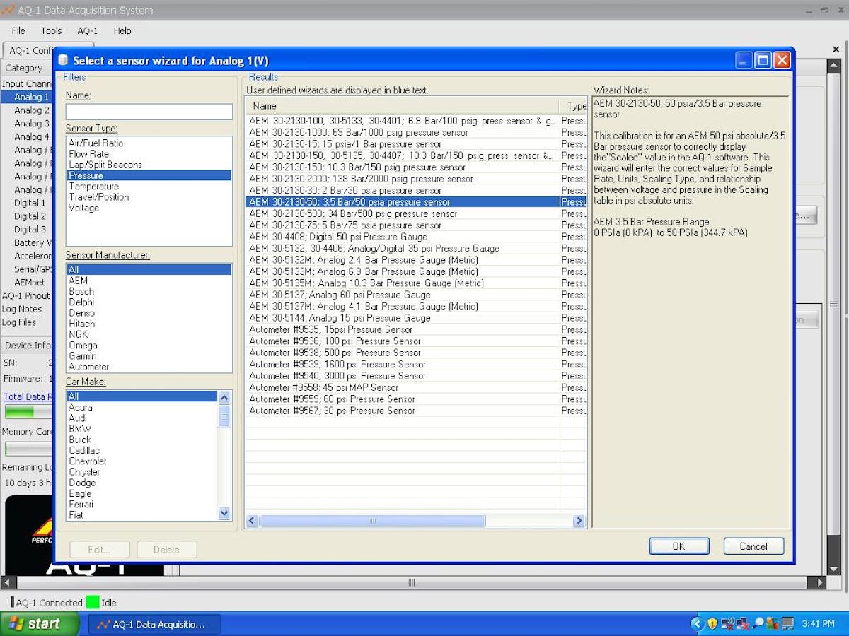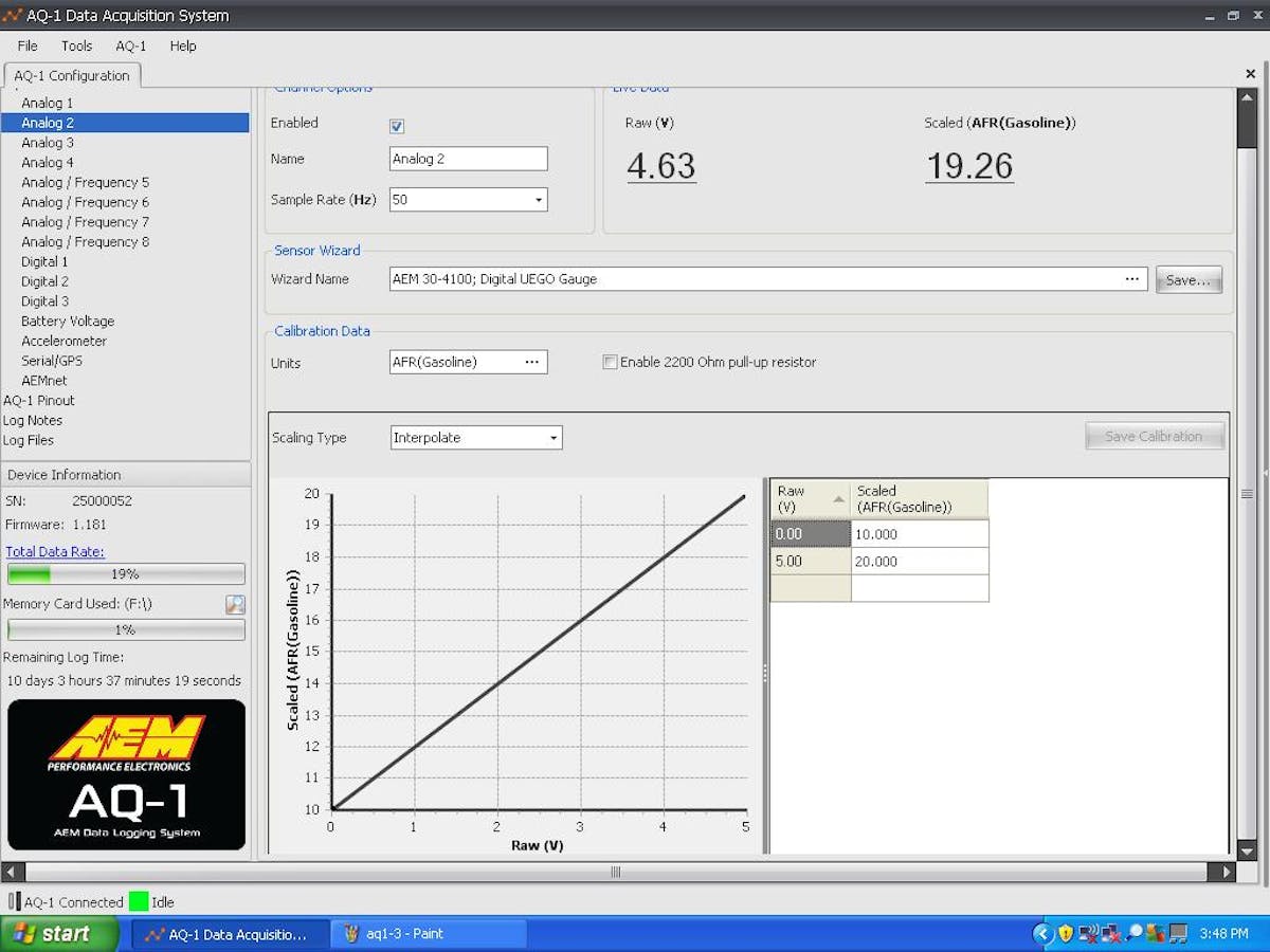 We walked through the AQ-1 setup process. The AQ-1 software is simple and straightforward to configure. Much like setting up a new piece of hardware on your home computer, the AQ-1 auto detects devices and inputs connected to it. The proper calibrations must be set and inputs to be logged selected.