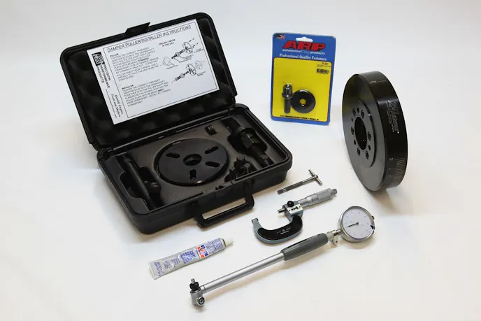 Shown are the special tools that you need to properly install a damper, include a 1-to-2-inch micrometer, a 0-to-2-inch dial-bore gauge, anti-seize, a dedicated installer/removal tool and a quality damper bolt. A proper-sized snap gauge can also be used to measure the inside diameter of the damper as long as the radius on the tip is smaller than the ID of the damper. Photos: Ed Taylor