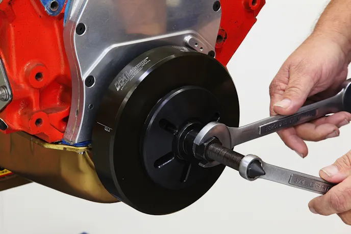 Use a dedicated installation tool, such as this one from Precision Performance Products, to slowly press the new dampener into place. Make sure that the dampener is square to the crank snout before starting. If the dampener is cocked before tightening the tool, it can cause the front of the crank to dig in and gall the inside of the dampener.