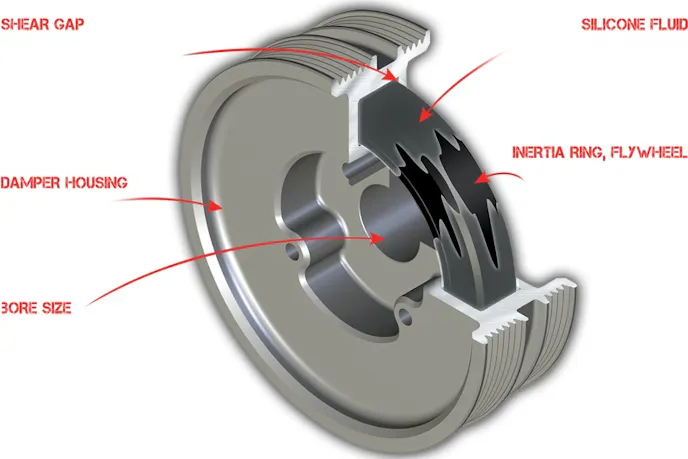A Fluidampr damper uses viscous technology to counter crankshaft vibrations. There are three basic parts to a Fluidampr damper: A CNC-machined housing and an inertia ring are separated by a layer of silicone. The idea is simple: the damper housing rotates at crankshaft speed. When there’s an extreme vibration, the shock moves into the housing and through a layer of silicon before reaching an internal inertia ring. This ring then absorbs the unwanted energy and actually slows down, compared to the engine rpm and the damper housing. As the inertia ring reacts and catches up with the engine rpm, it shears forward through the silicone layer. This free floating motion transfers torsional vibration energy into heat, which radiates through the housing. Fluidampr uses silicone instead of rubber because it dissipates heat better and doesn’t crack or separate with age.