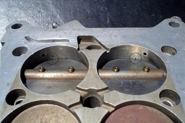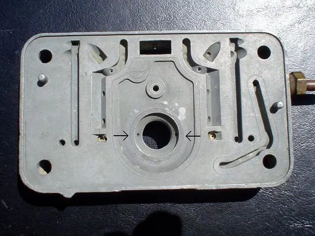 The Power Valve Channel Restrictions (arrows) are blocked off by the power valve, until manifold vacuum drops below the power valve rating.