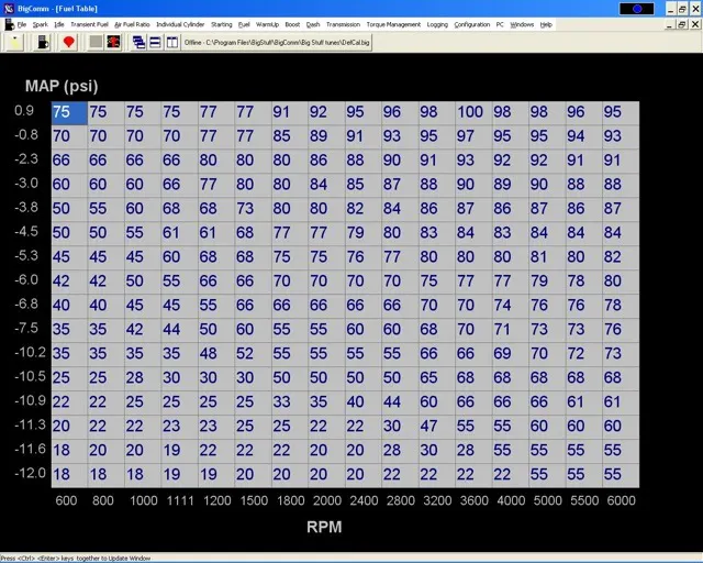 While tuning the air/fuel ratio at WOT, spark advance should be temporarily retarded to several degrees lower than your anticipated total timing. This is done to keep things safe while dialing in the air/fuel. We’re only tuning the fuel curve at this point, so maximum power production is not yet a concern. Ignition advance will be tuned separately at a later point.