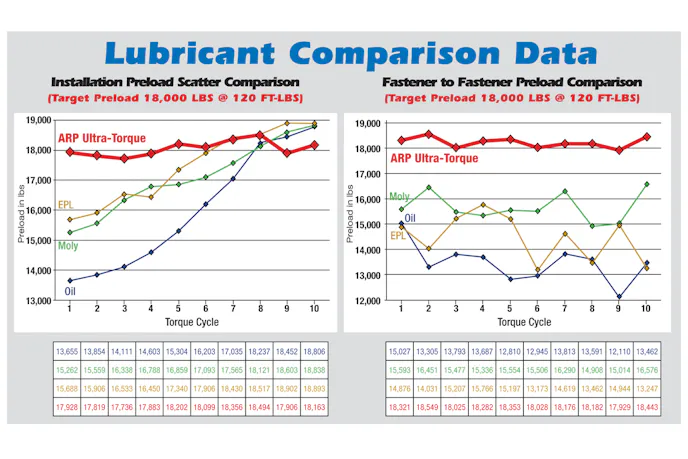 ARP, also, tested three of the industry standards while they developed their Ultra-Torque. Each of the four lubricants were tested in the same fashion and conditions for an accurate comparison between them. The Cycle Test had a targeted pre-load of 18,000 lbs for each test. One stud was used to test each lube through ten consecutive pulls. The torque applied to the stud was 120 lb-ft. and lubricant was re-applied after five consecutive cycles (tighten/loosen). The use of oil resulted in a very sharp incline through the torque cycle starting far below the 18,000 lbs objective at just below 14,000 lbs. Moly and EPL fared a bit better but still had a 3,000 lbs differentiation between the first and last pull. ARP Ultra-Torque lubricant stayed within its nearly spot on 18,000 lbs first pull through the entire 10 pull series.
