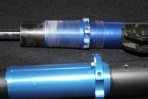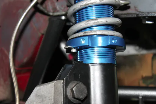 The top of the shock mounts to the caster/camber plate from underneath. From here, you can adjust the ride height to your preference.
