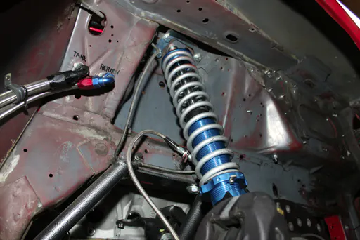 The Mustang was jacked up, the wheel removed and the old strut discarded for the time being. With the spring installed on the shock, the entire assembly drops right in place.