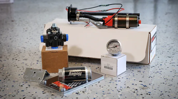 But let’s be real: the highlight of this kit is the drop-in, OEM-style Sniper EFI 340-liters-per-hour fuel pump, which can be used in a stock fuel tank and supports as much as 700 fuel-injected horsepower at 60 PSI of fuel pressure. Alongside this pump, the braided fuel lines, sleek black anodized AN fittings, and the adjustable fuel pressure regulator with gauge had me itching to get started.