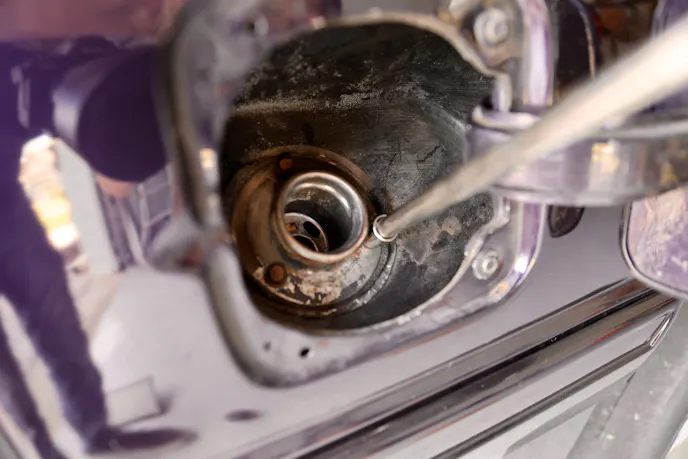 With the tank out, it was time to get the new Sniper EFI 340-liters-per-hour pump in. Removing the stock fuel pump was as simple as using a screwdriver and hammer to knock the retainer ring counterclockwise until it popped free. After pulling the old pump, I installed the new Sniper EFI unit with the included fuel filter screen, then tapped the lock ring back into place using a brass drift so as not to create sparks while securing it firmly. Before reinstalling the tank, I assembled and attached the -6AN pressure and return lines to the fuel pump.