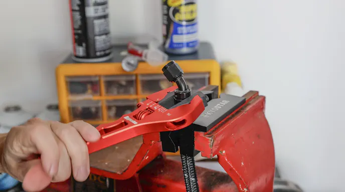 If you’ve never built AN lines before, it’s a pretty straightforward process. But you’ll need a few tools: vice jaws to hold the fittings and a specialized AN wrench (I recommend getting two) with protective inserts to avoid scratching up those beautiful anodized fittings.