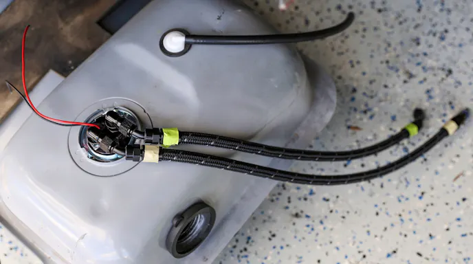 With the AN fittings attached to the hoses, I bolted both to the fuel pump. Then I installed the new vapor valve and hose, then connected the wiring — black to negative, red to striped positive, to the OEM wiring harness plug that I cut off from the original pump assembly. Finally, I was ready to reinstall the tank — but this time with the help of my neighbor, making the process much easier.