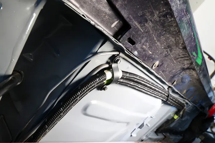 After routing, measuring, and marking the correct lengths, I ended up with the feedline length at 13.5 feet and the return line length at 12 feet. Once cut, I marked each line with colored tape: green for feed and white for return (to know which one I was working with) and attached the AN fittings to connect the fuel filter and junction. I then began routing and securing the lines along the body using a mix of brackets provided in the kit, along with drilling some locations for sheet metal screws to hang them along the way. For several of the brackets, I reformed the shape and customized them with a fresh coat of black paint to keep things subtle. A little personal touch never hurts.