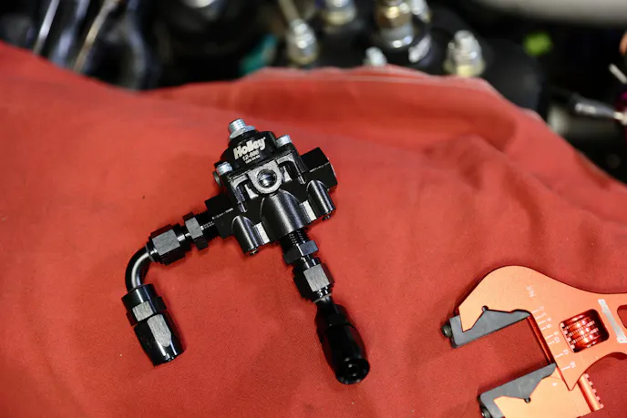 Things were moving along nicely! It was time to mount the fuel-pressure regulator for the return inlet and outlet and then attach both the feed and final return lines to the OEM fuel rails. For the regulator, Holley suggests mounting it to the top of the strut tower bolt using their included bracket, but I wanted a cleaner, more discreet look. Instead, I installed it inside the fender on the backside of the strut tower using an additional bracket supplied in the kit (and painted it black, of course).
