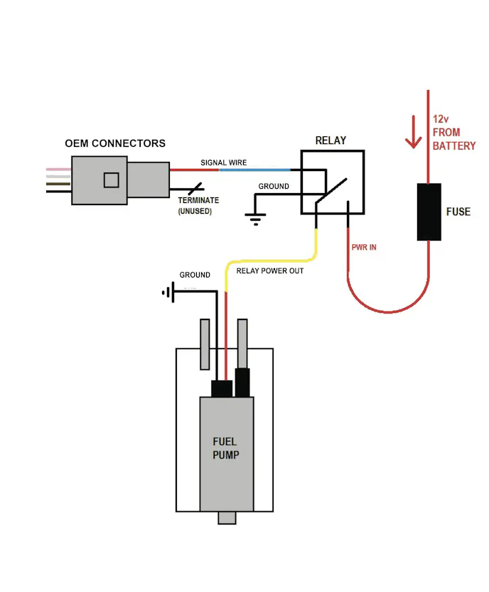 The next task on the list was to address the fuel pump relay. The Holley kit I purchased includes a 30-amp relay and wiring, but my ‘93 Mustang GT already has a 30-amp relay with 10-gauge wiring to the relay and 12-gauge to the pump. Since that was more than sufficient, I opted to keep my factory relay setup for now, though I advise that you check your factory relay and wiring to make sure it is nothing less than this – or if you are installing the 525-liters-per-hour pump kit, you need to upgrade the relay. So for this story, I’ve provided a simple diagram in case your car needs the upgrade.