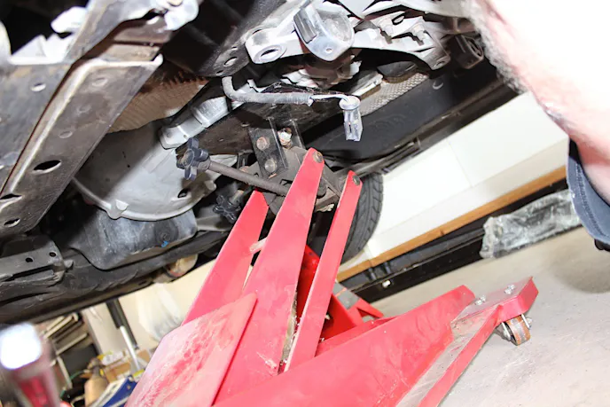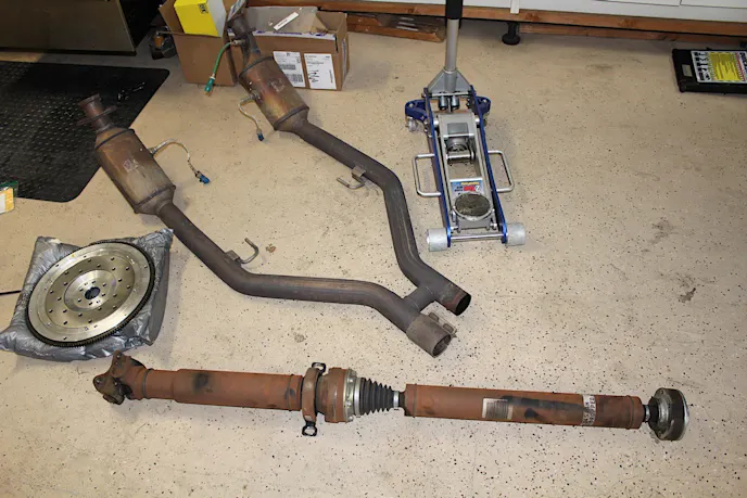 Once we disconnected the battery and got the car lifted off the ground and on jack stands, the installation began by removing the essentials, which included the factory H-pipe and cat-back, as well as the factory driveshaft and the transmission crossmember. (We used the trans jack to support the transmission during the removal.)
