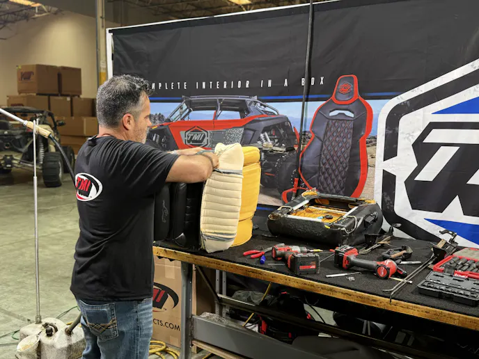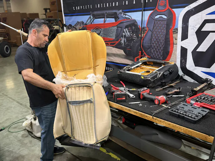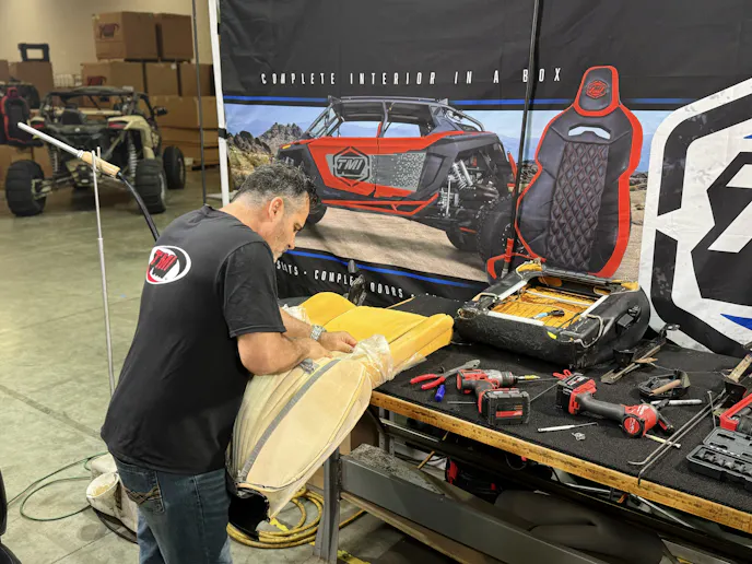 The process began by removing the seats and stripping away the old covers and hog rings. With the original foam discarded, TMI’s high-density replacements were glued into place using a quality urethane adhesive. The new covers were dry-fitted to check alignment before being secured with fresh hog rings from the center outward. Gentle heat was used to relax tight corners and ensure a factory-smooth finish.