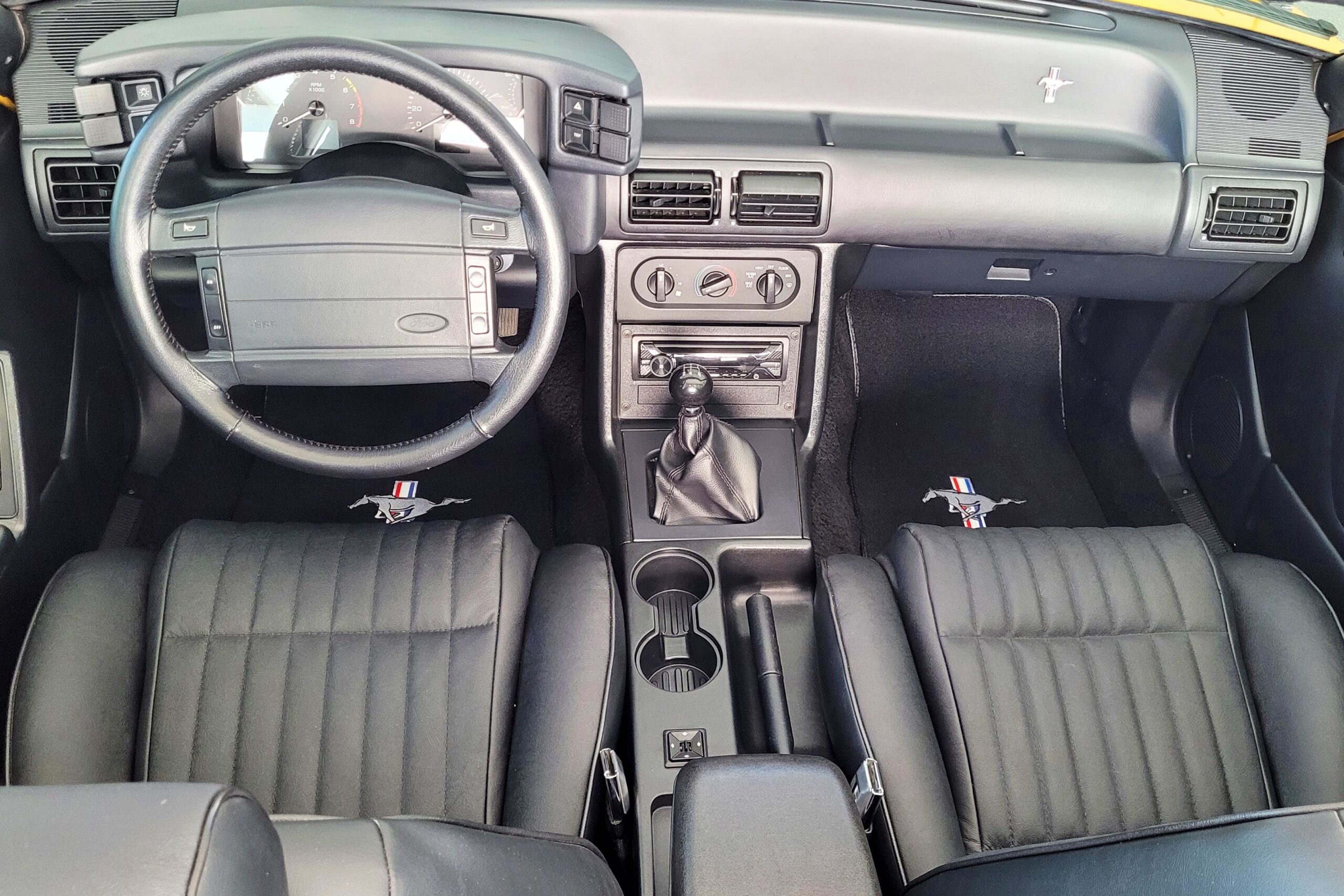 Down low, new Pony Logo Carpeted Floor Mats (P/N ACC-7993BLK-110; $119.99) replaced the threadbare originals, while a Map Pocket Delete Kit (P/N LRS-23942MPDA; $91.58), fresh Door Sill Plates with the Running Pony emblem (P/N LRS-13208A; $46.99), and matching Scuff Plate Hardware Kit (P/N LRS-13208HDW; $3.99) finished off the entry points.