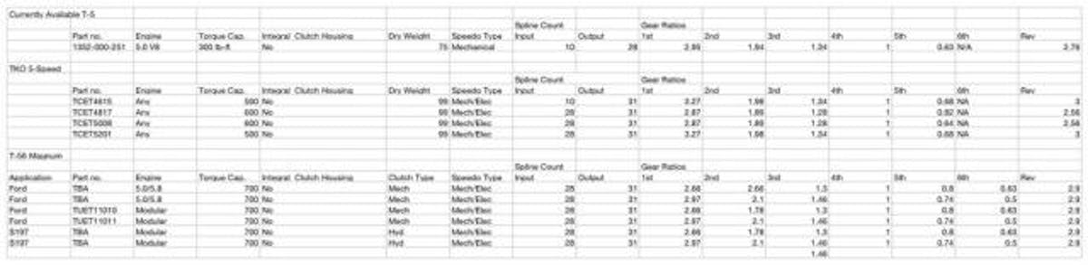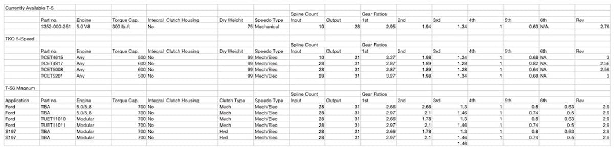 • Factory Transmissions: T-45 5-speed (1999-2000), 3650 5-speed (2001-2010), T-56 6-speed (2000 Cobra R)