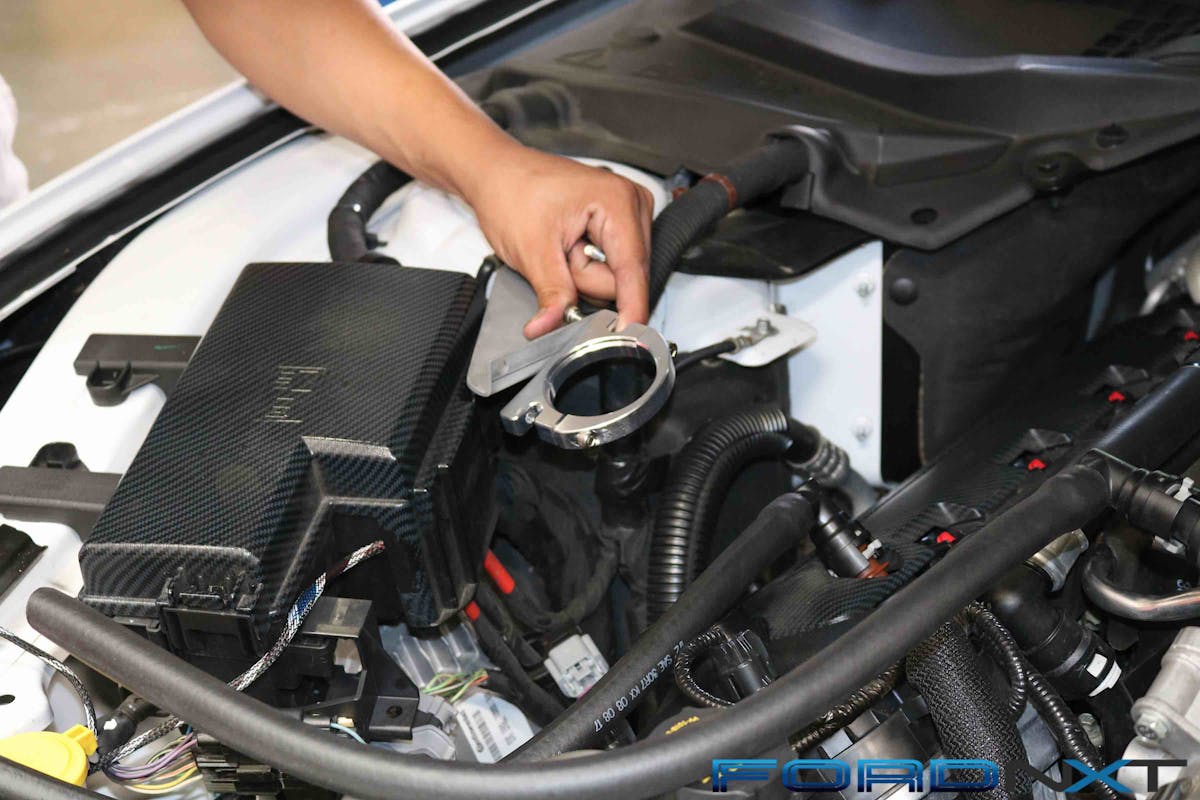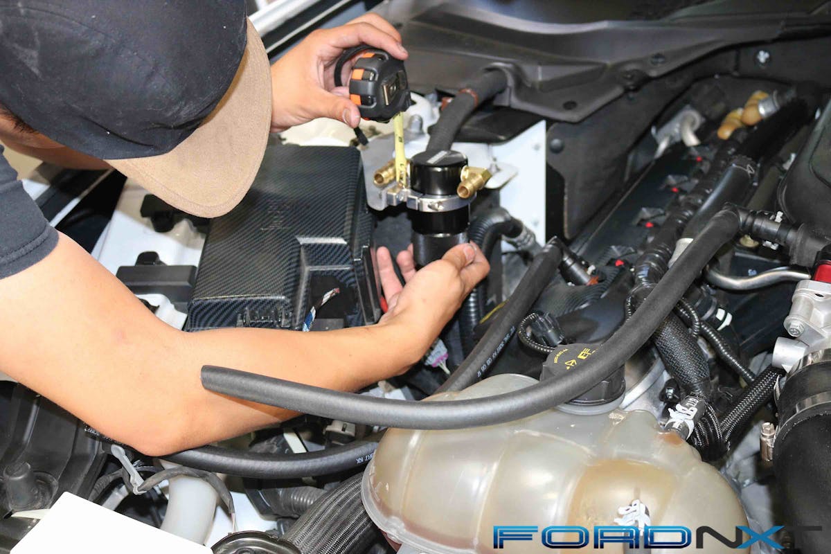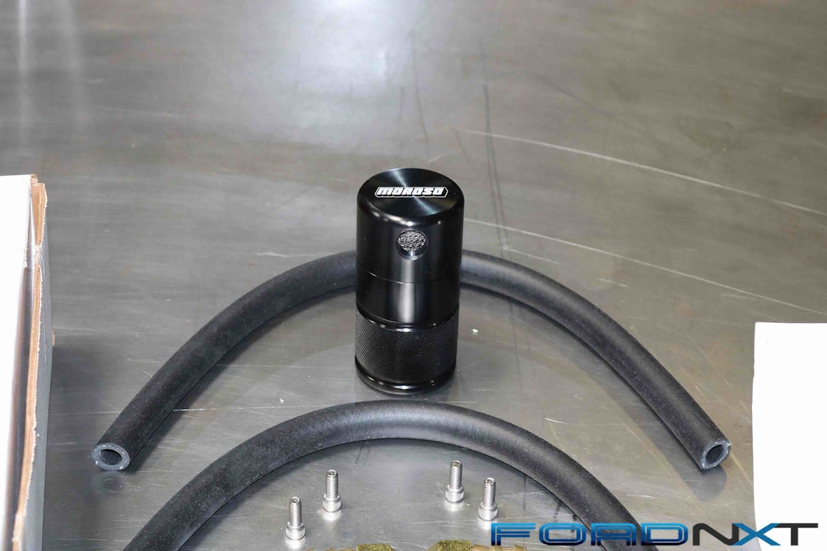 The Moroso Oil catch can arrived with everything we needed to install it on Mathew’s 2015 Mustang GT. It was a simple as unboxing the system and setting up a date for the install to take place. The kit includes heavy duty brass inlet and outlet fittings, Fuel/Emission/PCV Vapor hose, stainless steel mounting bracket and billet aluminum mounting clamp for the body of the separator the Air-Oil Separator itself features a billet aluminum body with internal baffling and mesh media to capture excess oil effectively.