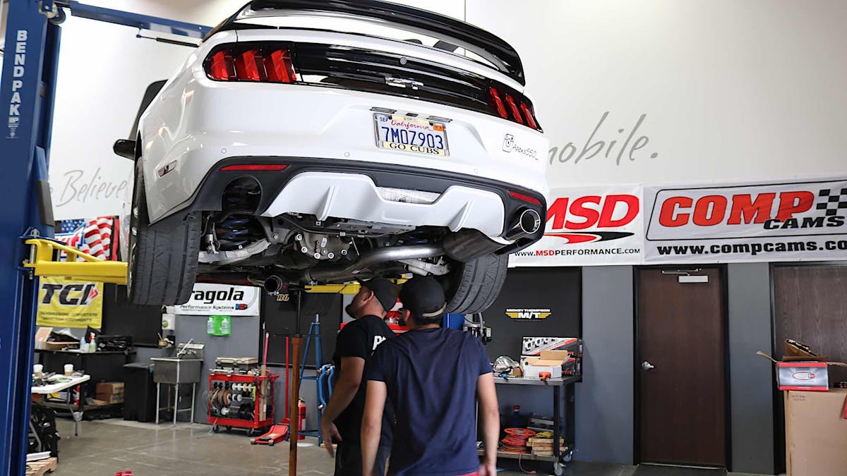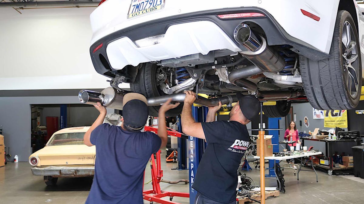 Once we found the exhaust we were looking for, we ordered the parts and set up an install date at the Power Automedia Tech Center. The parts arrived on schedule, and we put Matthew’s S550 on the lift to remove his old exhaust.