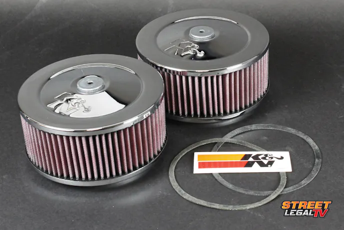 The air cleaner assemblies come with a base gasket for a standard 5-1/8-inch carburetor neck, a chrome base and lid, the 3-inch air filter, and a rubber and solid washer for mounting. We now have a pair of larger filters that are a half-inch taller than the paper filter we had before, and with a K&N cleaning kit we are happy to say that we won’t ever have to replace these filters again.
