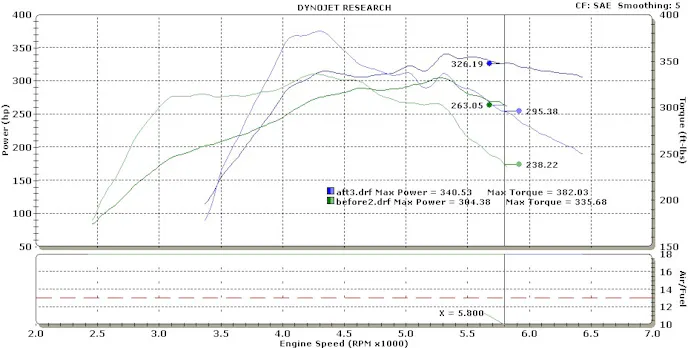 We then switched over to the custom tune for 91 octane, and managed to make an extra 36.15 horsepower and 46.35 ft-lbs of torque over stock at peak, with a new total of 340.53 horsepower and 382.03 ft-lbs. Where you see the big power gains is above 5,800 rpm where the tune is making 63.14 horsepower and 57.16 ft-lbs. The tune helps extend the power band an additional 700 rpm over stock.